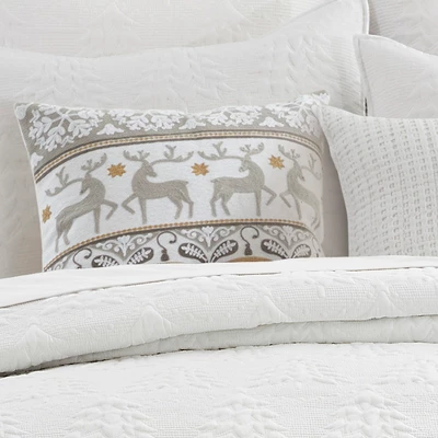 The Reindeer decorative pillow matches perfectly with the Levtex Home O Christmas Tree bedding collection. This pillow is sized at 18x18in. and features intricately stitched rows of reindeer and ornaments in an array of neutral tones on a textured ground The taupe, cream color palette makes this a versatile accessory for your bed, couch or favorite chair. The pillow comes pre-filled with a soft, luxurious feather inner.