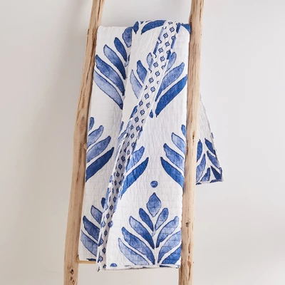 The Vintage Blossom Reversible Throw by Levtex Home is inspired by a collection of bamboo fans. Offered in classic blue and white, this design will immediately transform any room in your home. This throw features a sophisticated fan pattern on the front, reversing to a small blue and white medallion on white on the back. The Throw (50x60in.) has a cotton front and cotton back, filled with a cotton-rich filler, and is machine washable. Enjoy this for years to come!